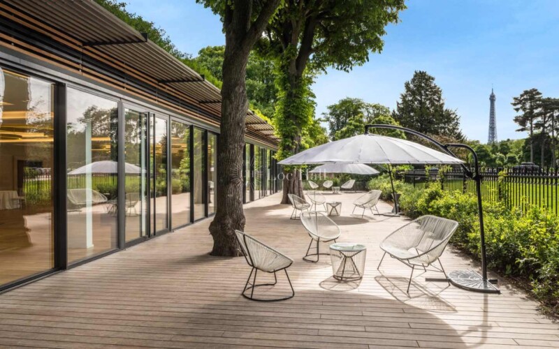 Les espaces extérieurs sont de vrais atouts pour vos événements: espace de cocktail ou de pause en cas de beau temps, coin fumeur ou simplement vue dégagée sur la verdure, le lac principal du bois de Boulogne le jour ou la Tour Eiffel illuminée la nuit..