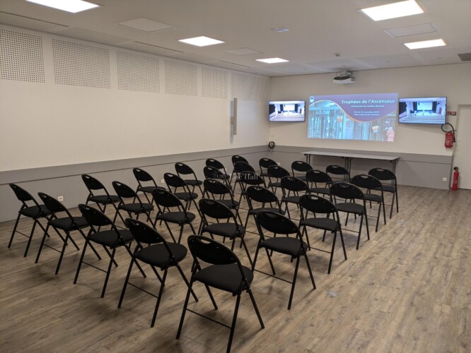 Le matériel technique (écran, sonorisation, vidéo-projecteur, micro...) est intégré à l'Auditorium. Les autres espaces sont vides de tout mobilier et matériel à prévoir à vos frais.